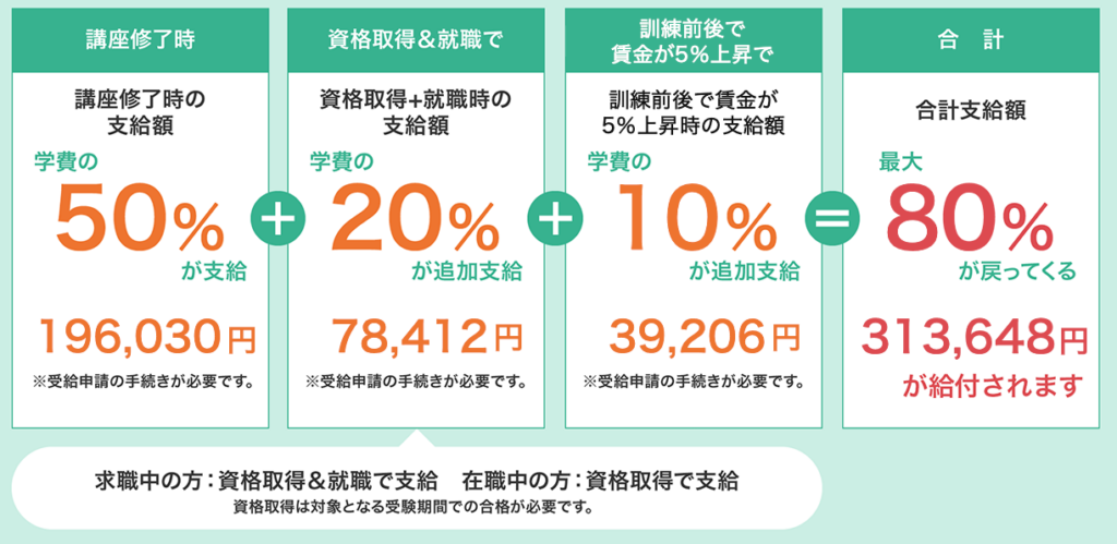 専門実践教育訓練給付金(最大80%)を利用すれば10万円以下に。 - 就職サポートあり